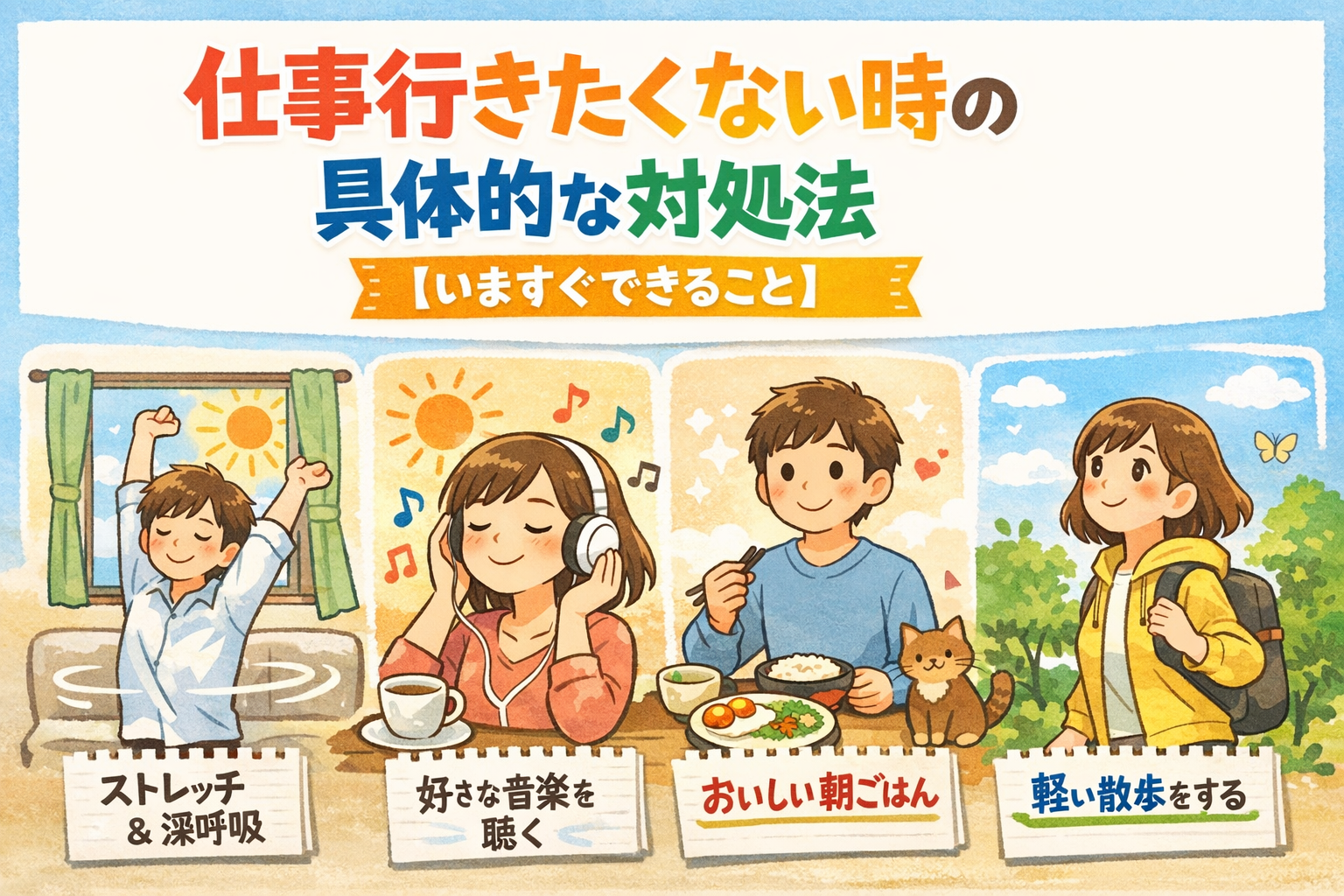「仕事に行きたくない」という気持ちに気づいたら、まずは無理をせず、自分を労わることから始めましょう。すぐに試せる対処法をいくつかご紹介します。