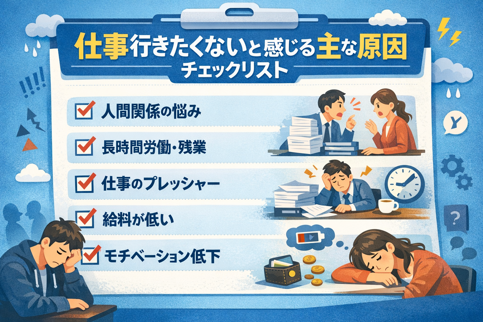 「仕事に行きたくない」と感じる背景には、様々な要因が複雑に絡み合っていることがあります。まずは、ご自身の状況と照らし合わせながら、主な原因をチェックしてみましょう。
